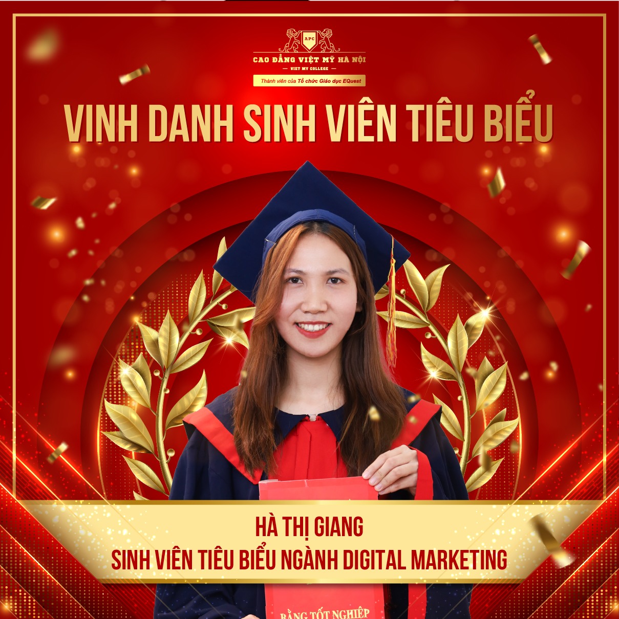 Ngày lễ tốt nghiệp không chỉ là dấu mốc quan trọng trong hành trình học tập của các sinh viên mà còn là dịp để Trường Cao Đẳng Việt Mỹ Hà Nội vinh danh những cá nhân xuất sắc, những người đã nỗ lực hết mình và gặt hái được thành tích đáng tự hào. Tại lễ tốt nghiệp khóa 21 vừa qua, những sinh viên tiêu biểu như Hà Thị Giang (ngành Digital Marketing), Trần Tiến Nam (ngành Thiết kế Đồ họa), Nguyễn Thị Thu Hiền (ngành Chăm sóc Sắc đẹp), Trần Thu Hân (ngành Ngôn ngữ Hàn), và Nguyễn Thị Ngọc Chi (ngành Quản trị Doanh nghiệp) đã ghi dấu ấn với thành tích học tập xuất sắc. Đây là những gương mặt sáng giá, đại diện cho sự phát triển không ngừng của các ngành nghề mà trường đào tạo.