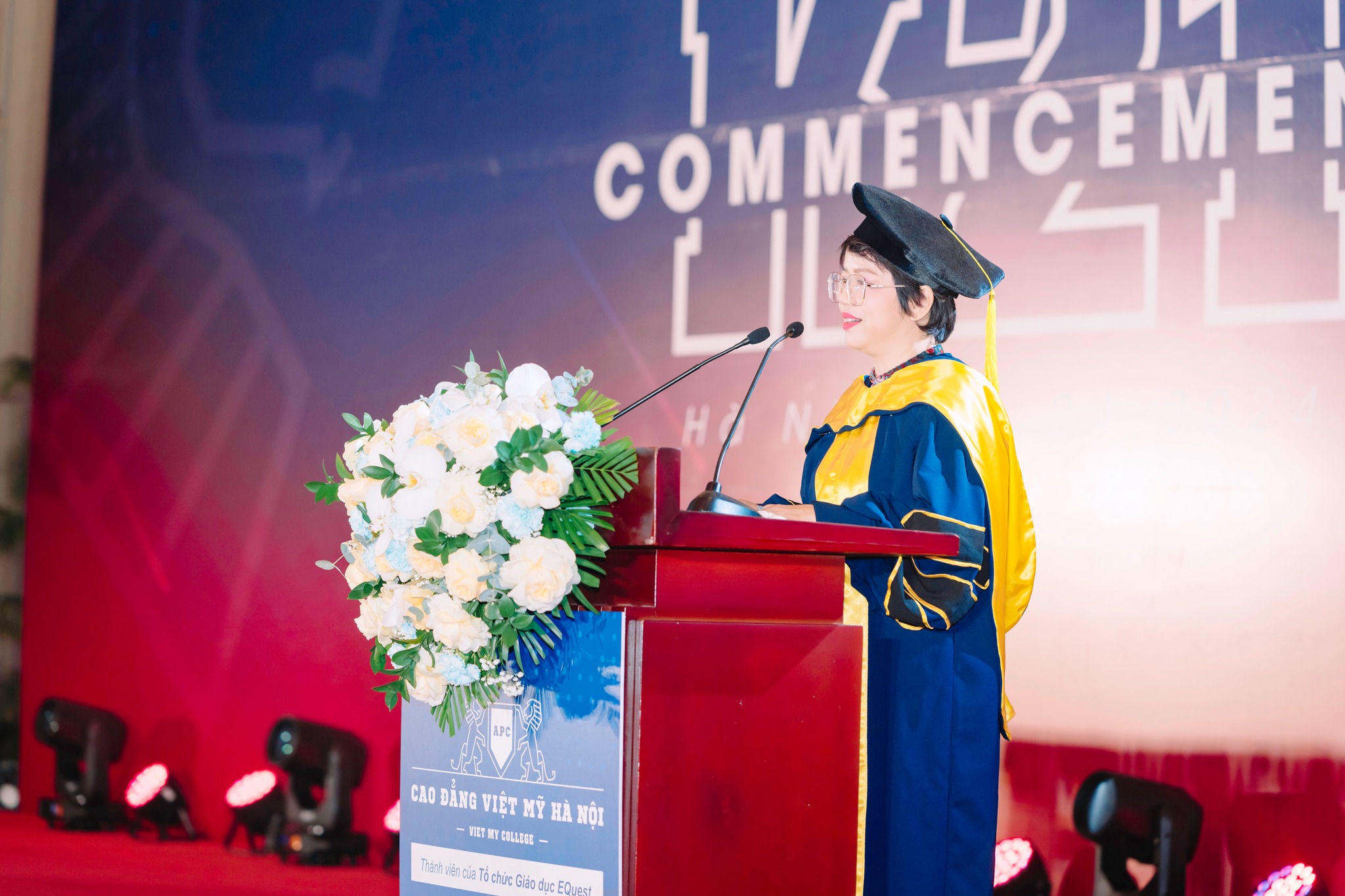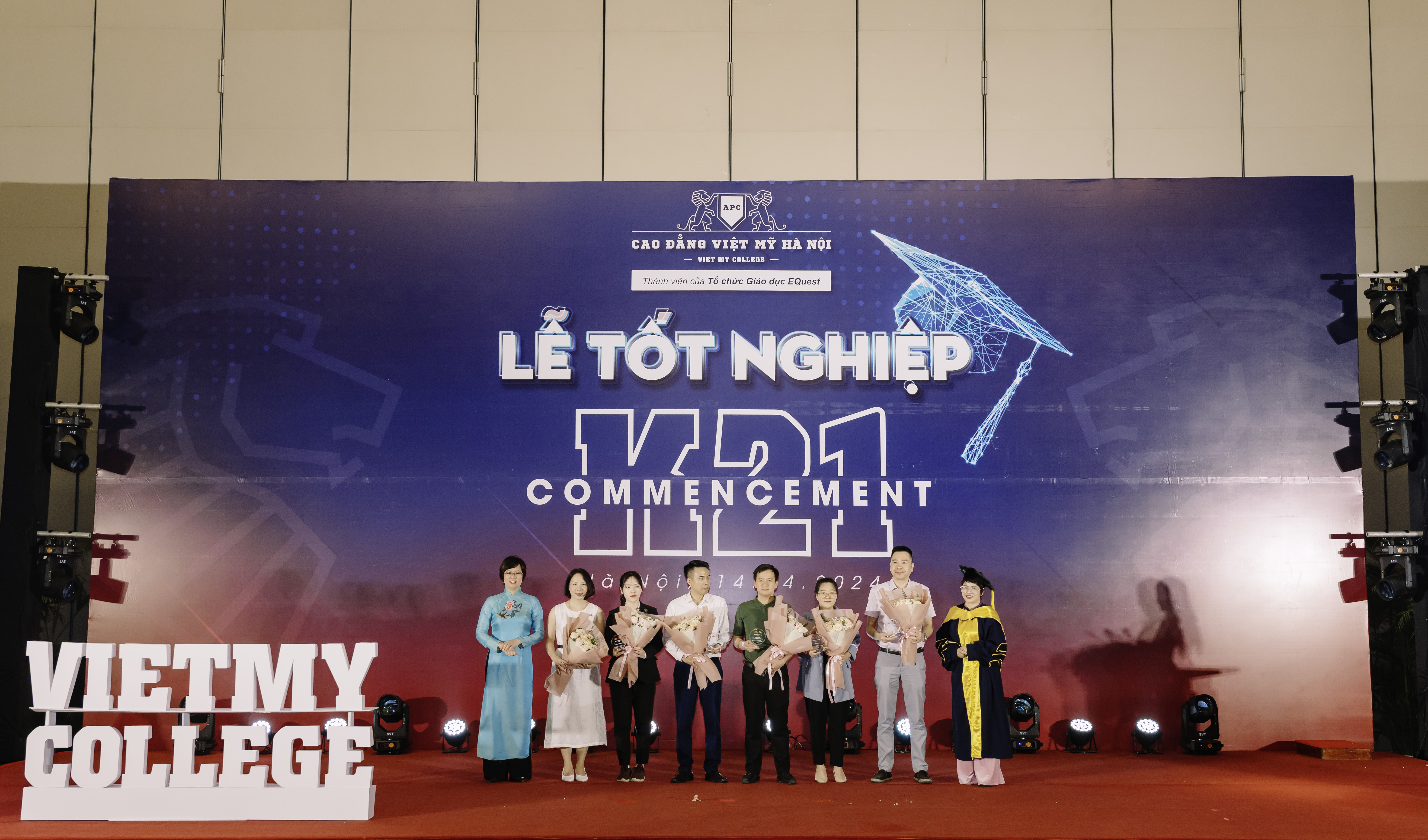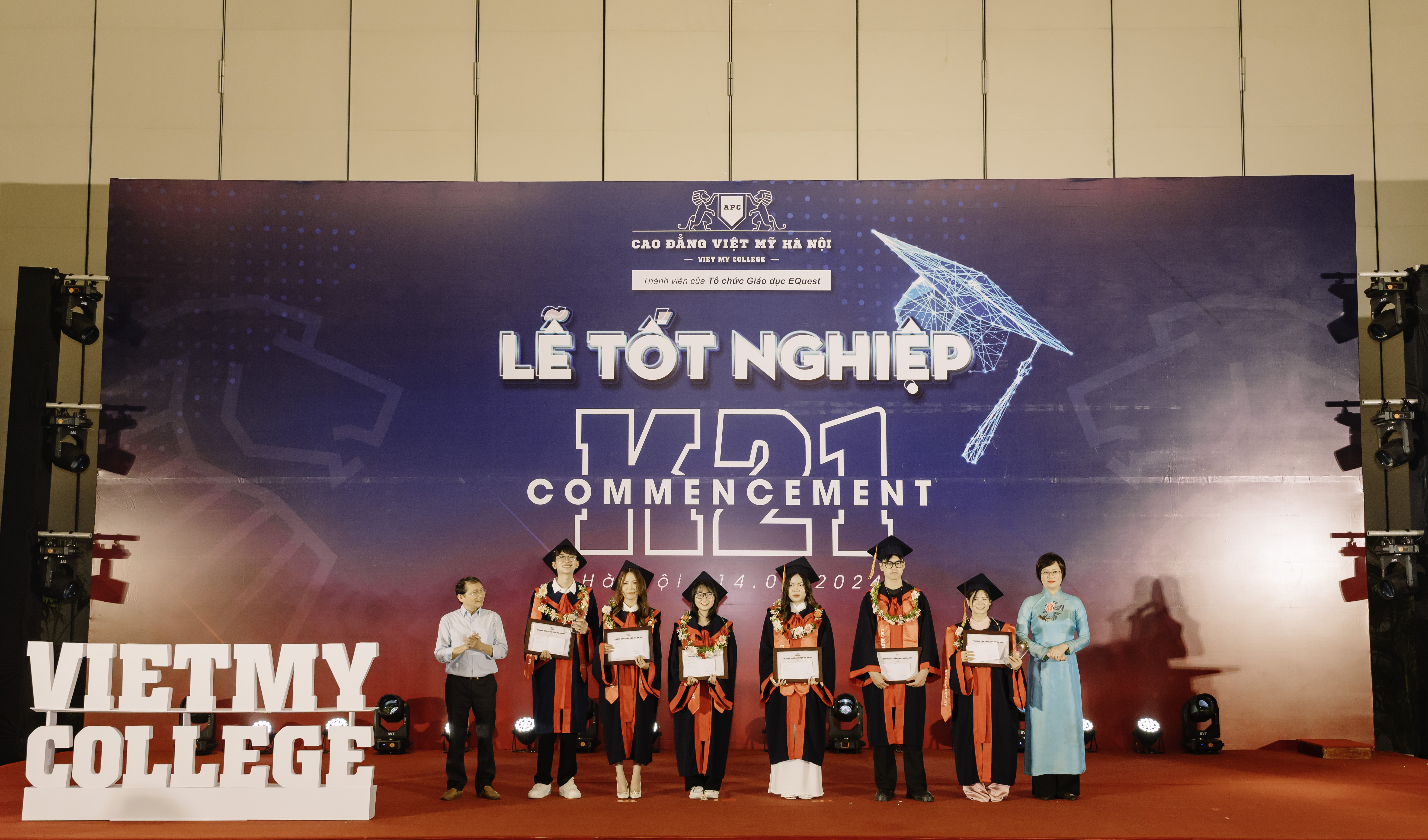 "Tôi rất lấy làm hạnh phúc khi đứng đây, trong buổi lễ đặc biệt này và thực sự rất tự hào với những thành quả của sinh viên K21 khi trưởng thành tại Ngôi trường Cao đẳng Việt Mỹ Hà Nội. Để chúng ta cùng chứng kiến những giây phút quý trọng nhất của một chặng đường “vươn tới sự hoàn thiện” - như Slogan của Tập đoàn Giáo dục EQuest. Hôm nay các em được gia đình, nhà trường và xã hội chính thức công nhận với Danh hiệu Cử nhân chính quy của hệ thống giáo dục nghề nghiệp Việt Nam," Hiệu trưởng phát biểu.