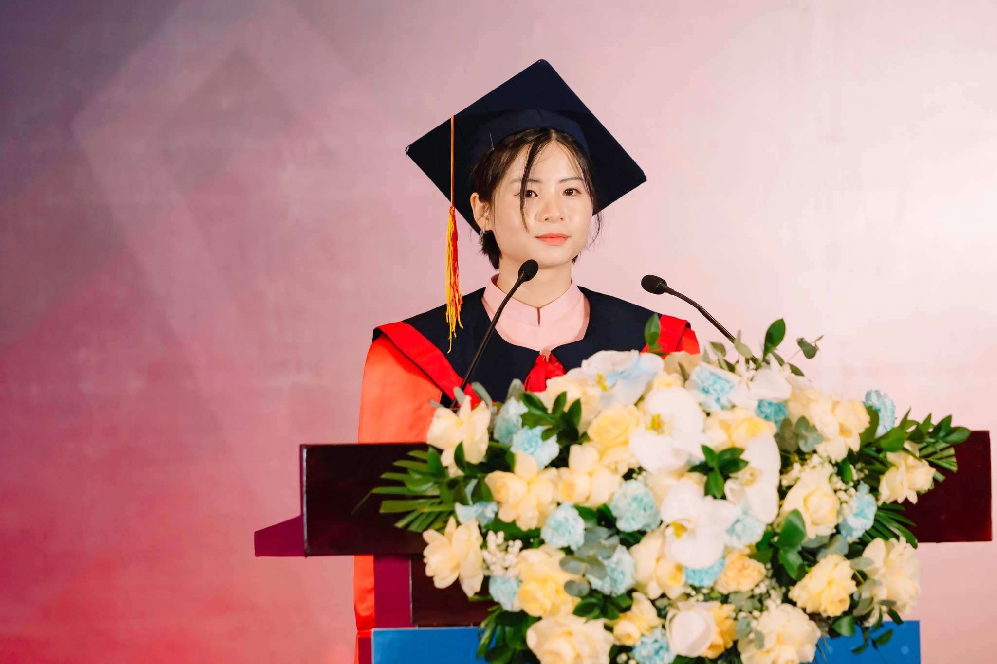 Tân Thủ khoa Đinh Thị Quỳnh có lời chia sẻ truyền cảm hứng tới toàn bộ sinh viên, thầy cô, khách mời tại buổi Lễ Tốt nghiệp