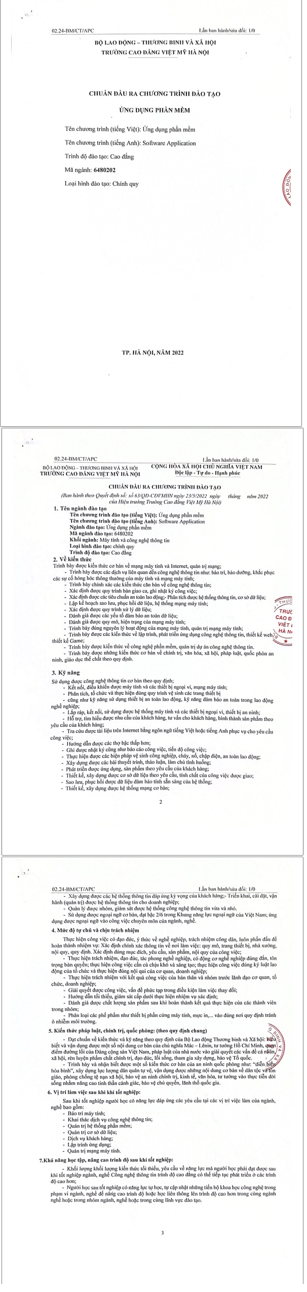 QĐ chuẩn đầu ra chuyên ngành ứng dụng phần mềm cao đẳng Việt Mỹ Hà Nội 2022